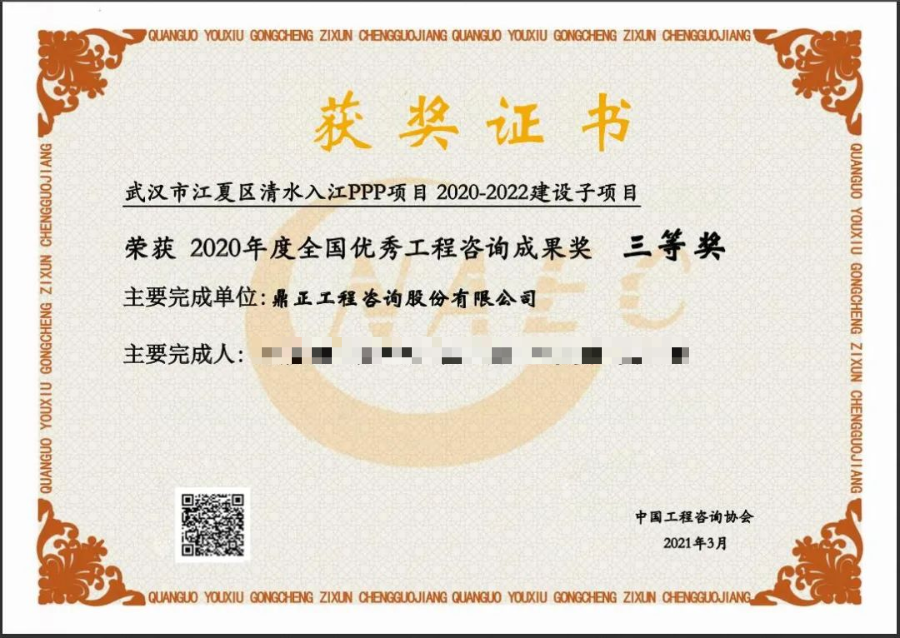 2021年3月5日,中國工程咨詢協(xié)會公布了“2020年度全國優(yōu)秀工程咨詢成果獎”獲獎項目名單,鼎正咨詢繼2019年全咨項目榮獲全國優(yōu)秀工程咨詢成果獎后,又一PPP咨詢項目——由鼎正咨詢獨立編制完成的“武漢市江夏區(qū)清水入江PPP項目 2020-2022建設(shè)子項目”實施方案再度榮獲全國優(yōu)秀工程咨詢成果三等獎!