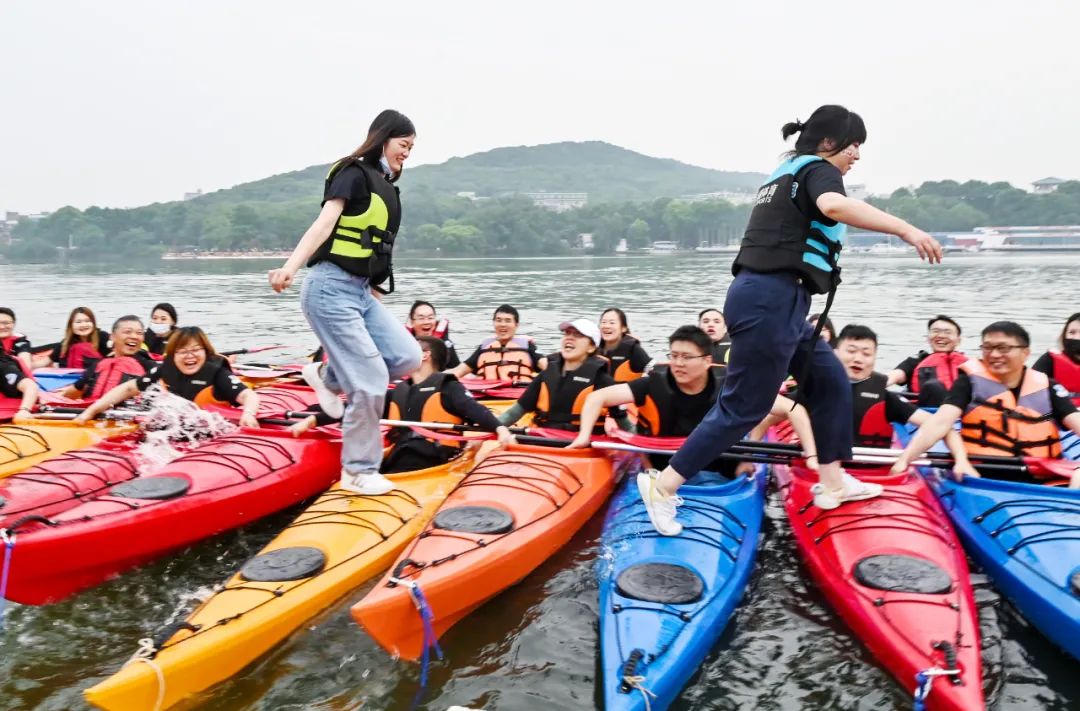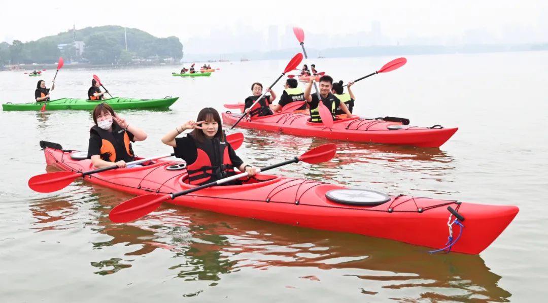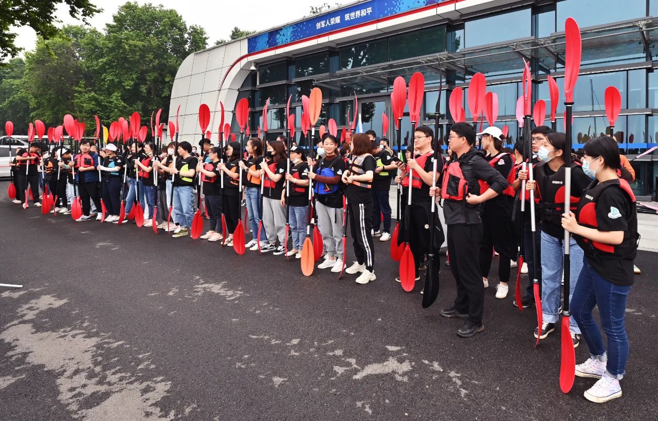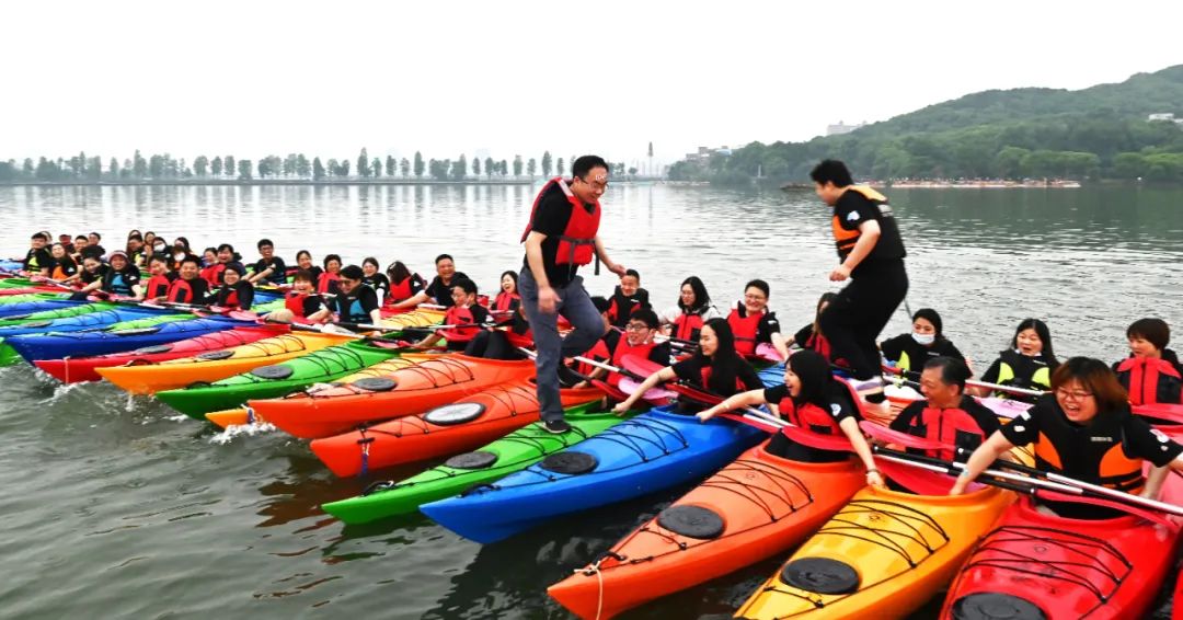 接下來是皮劃艇環(huán)節(jié),五顏六色的皮劃艇整齊的排列在地上,小伙伴們?cè)缫哑炔患按拇┥狭司壬拢闷鹆舜瑯R的方陣蠢蠢欲動(dòng),頗有“百萬雄師過大江”的氣勢(shì)。
