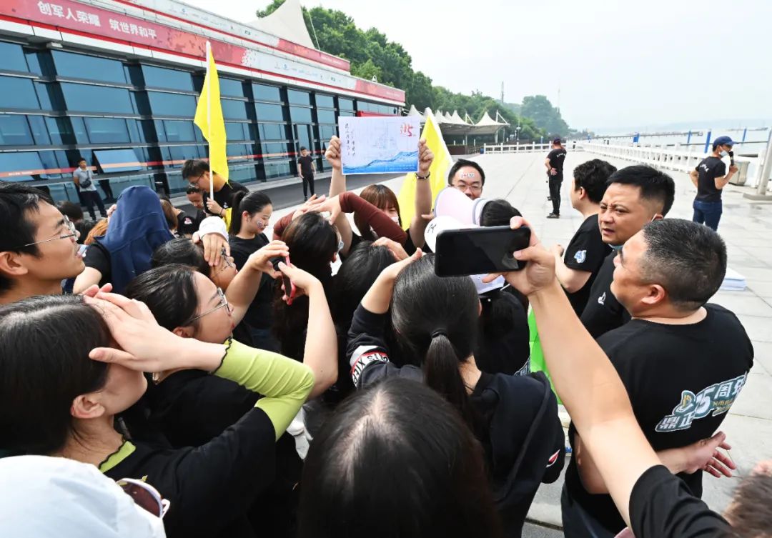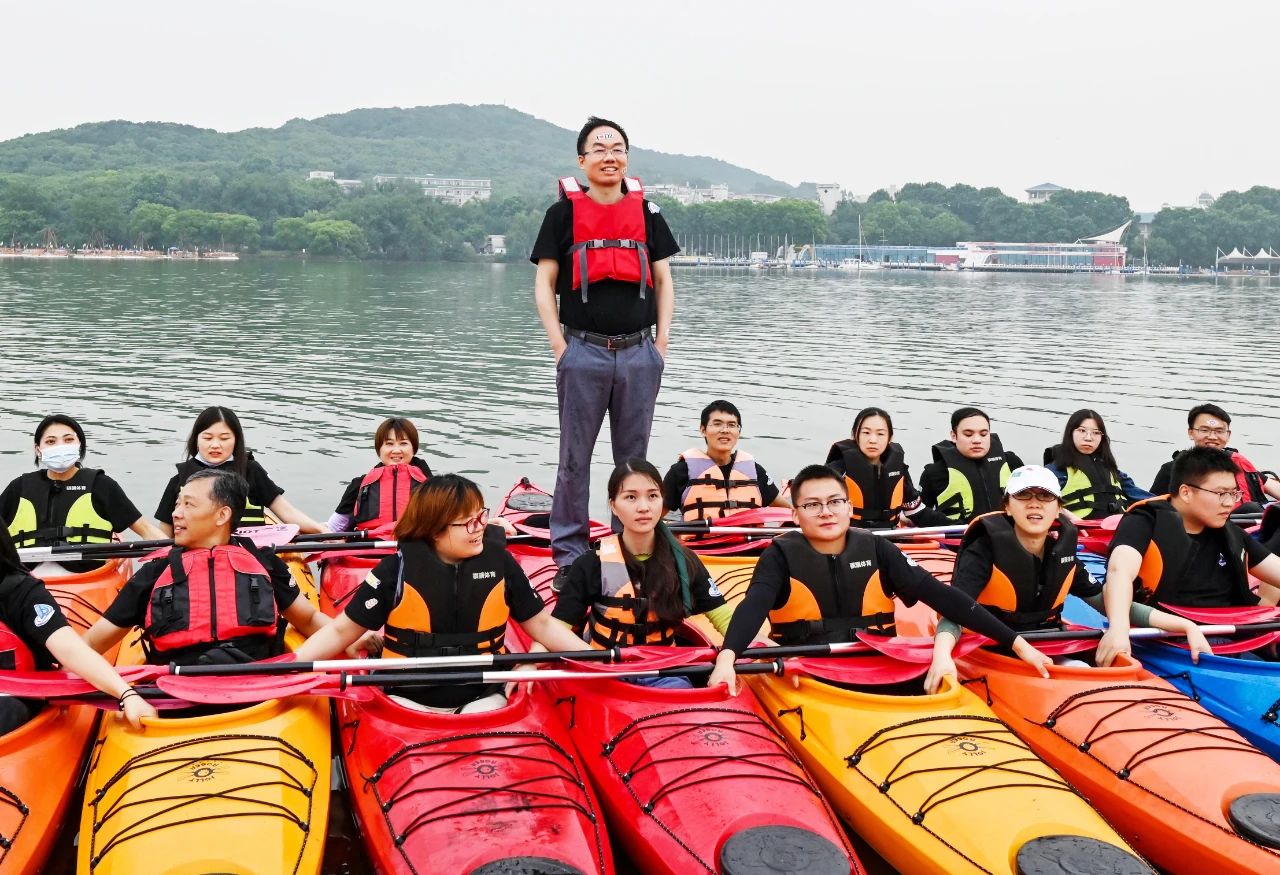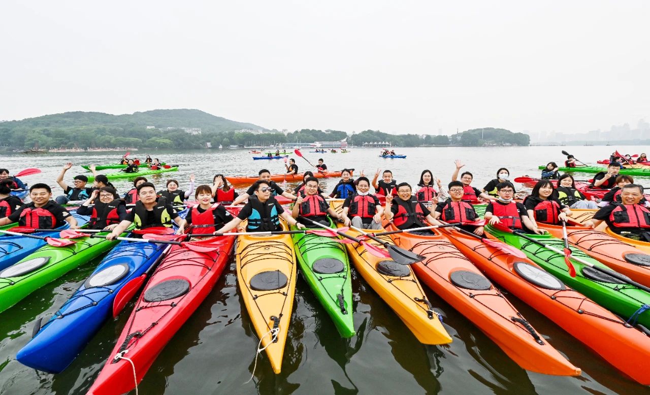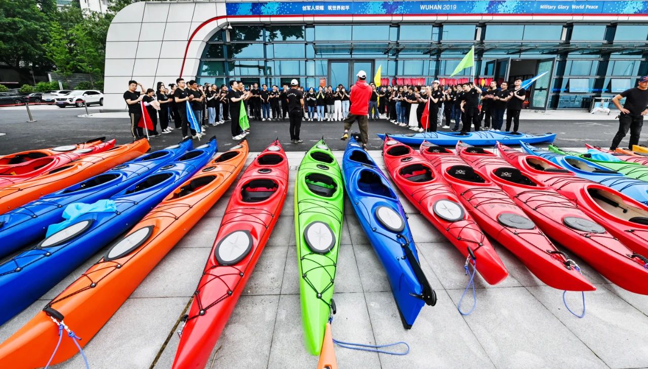 接下來是皮劃艇環(huán)節(jié),五顏六色的皮劃艇整齊的排列在地上,小伙伴們?cè)缫哑炔患按拇┥狭司壬拢闷鹆舜瑯R的方陣蠢蠢欲動(dòng),頗有“百萬雄師過大江”的氣勢(shì)。