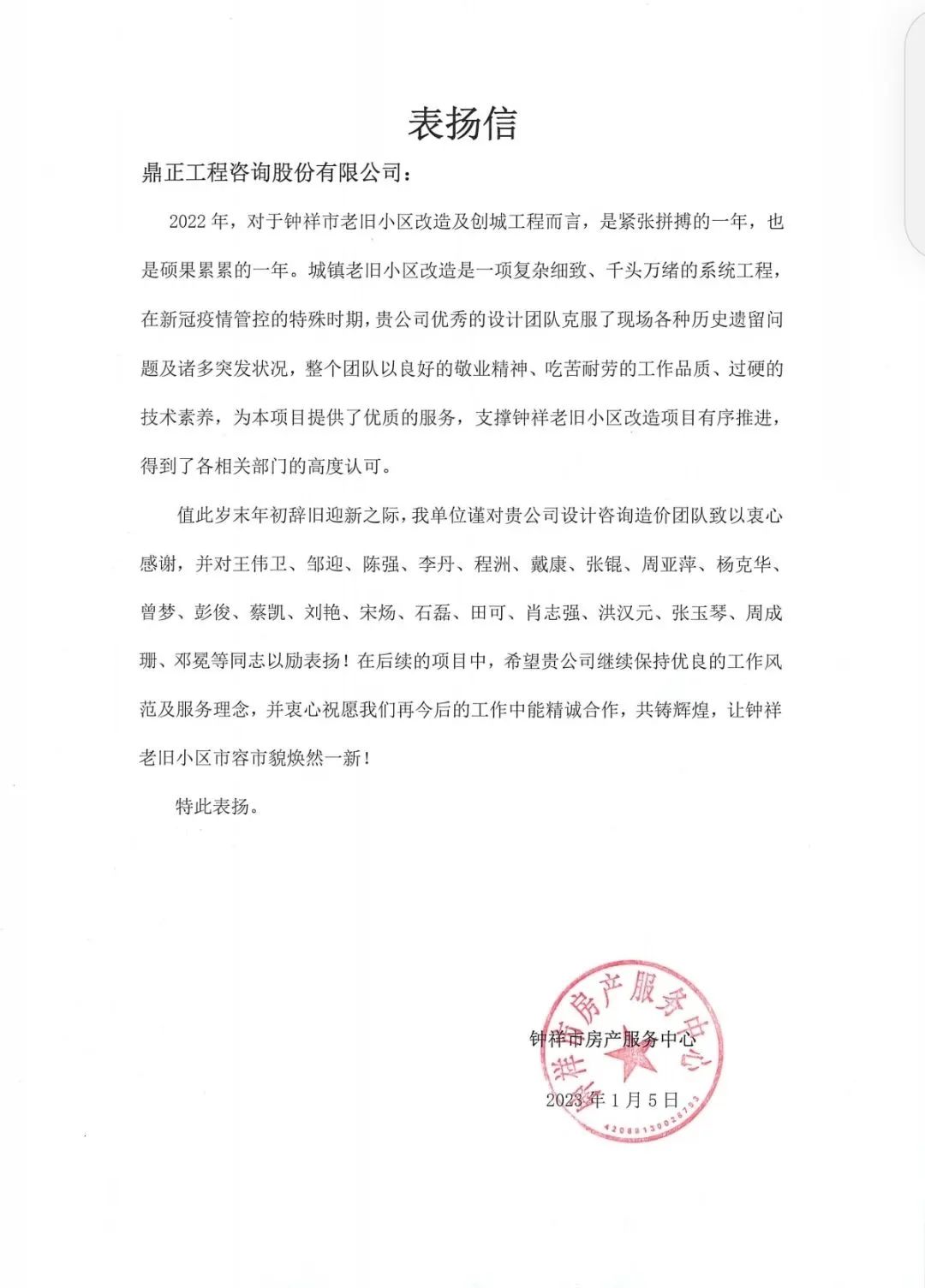 寒冬歲末之際,陸續(xù)接收到多封表?yè)P(yáng)信、感謝信,一個(gè)個(gè)贊許,一句句肯定,是鼎正成績(jī)單上最好的評(píng)語(yǔ),感謝每一位業(yè)主的認(rèn)可和督促,因?yàn)橛心銈?,才能讓我們成為更好的自己?br />