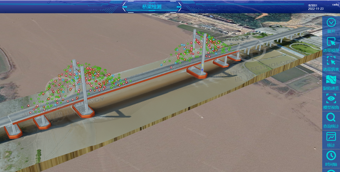 無人機搭載自研專用相機對橋梁進行全覆蓋高清圖像采集,再利用智能算法自動完成缺陷的定性判斷、定量測量、精準定位,并將處理結果映射至三維實景模型上,自動生成滿足定檢要求的數據報告。