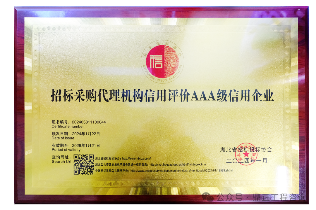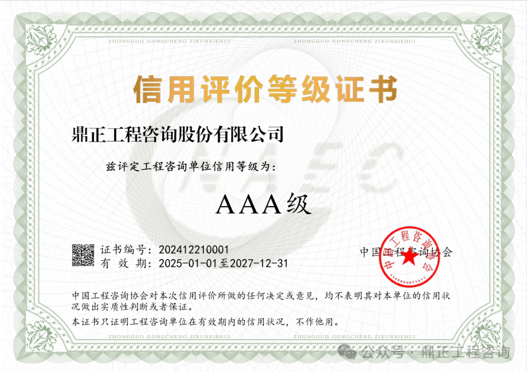 近日,中國工程咨詢協會發布了2024年度工程咨詢單位信用評價公告,鼎正憑借優異的誠信建設和信用管理能力,榮獲“AAA級信用等級”評價。