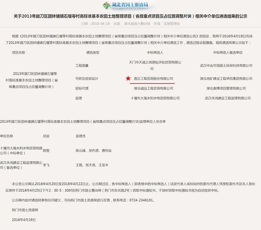 【經(jīng)營成果】我司入選2013年掇刀區(qū)團(tuán)林鋪鎮(zhèn)石堰等村高標(biāo)準(zhǔn)基本農(nóng)田土地整理項(xiàng)目(省級(jí)重點(diǎn)項(xiàng)目壓占位置調(diào)整片塊)相關(guān)中介單位