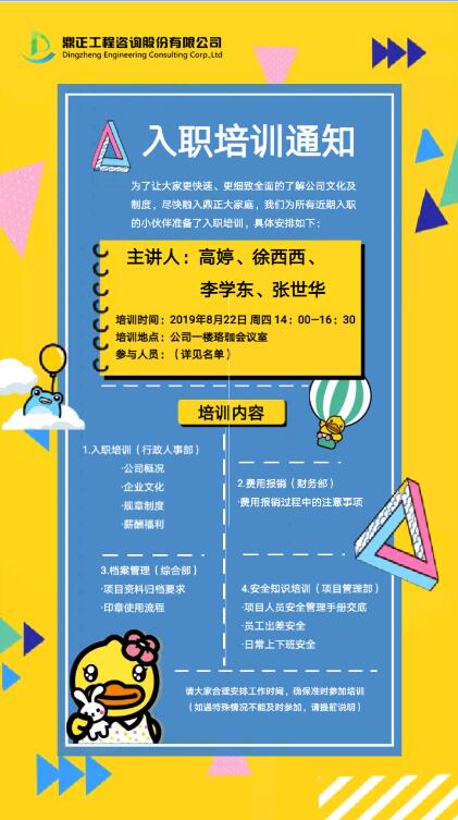 8月22日下午,鼎正咨詢8月新員工入職培訓于鼎正珞珈多功能廳舉行,副總經理毛迎霞出席,13名新員工參與本次培訓。本次培訓旨在幫助新員工們盡快了解公司企業文化與發展歷程、熟悉公司相關規章制度,增強員工的歸屬感,提升員工的工作技能,快速融入公司。